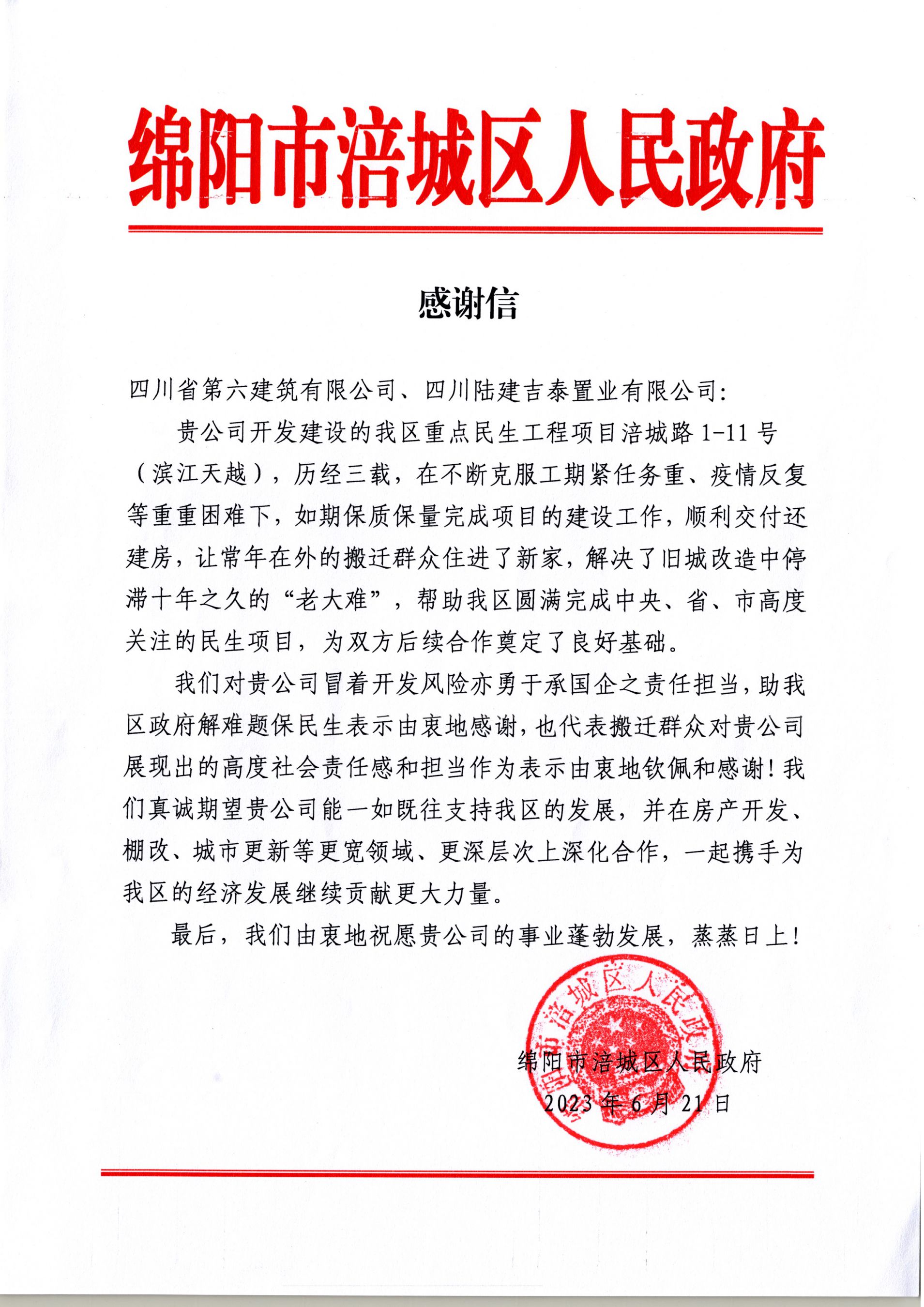 “歷經(jīng)三載,如期保質(zhì)保量完成項目建設(shè)工作……讓常年在外的搬遷群眾住進(jìn)了新家,解決了舊城改造中停滯十年之久的‘老大難’,幫助我區(qū)圓滿完成中央、省、市高度關(guān)注的民生項目……”6月21日,在一封來自綿陽市涪城區(qū)人民政府的感謝信中,他們?nèi)缡钦f道。