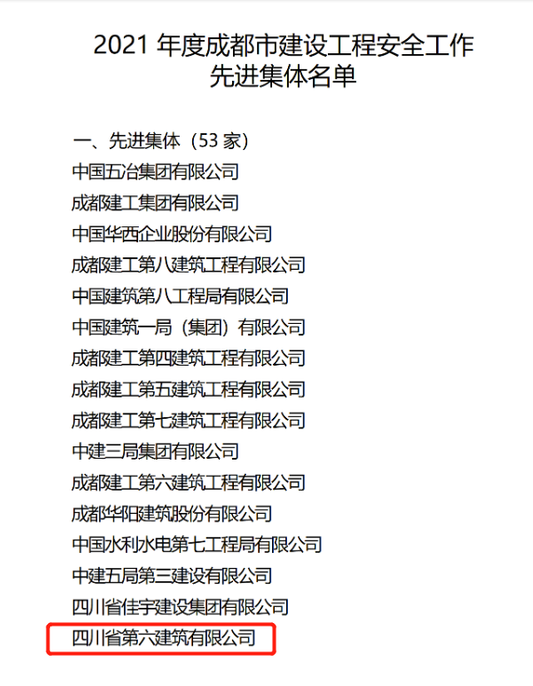 近日,成都市住建局公布了榮獲2021年度成都市建設(shè)工程安全工作先進(jìn)集體的名單,四川六建從眾多建筑企業(yè)中脫穎而出,榮獲“2021年度成都市建設(shè)工程安全工作先進(jìn)集體”稱號(hào)。