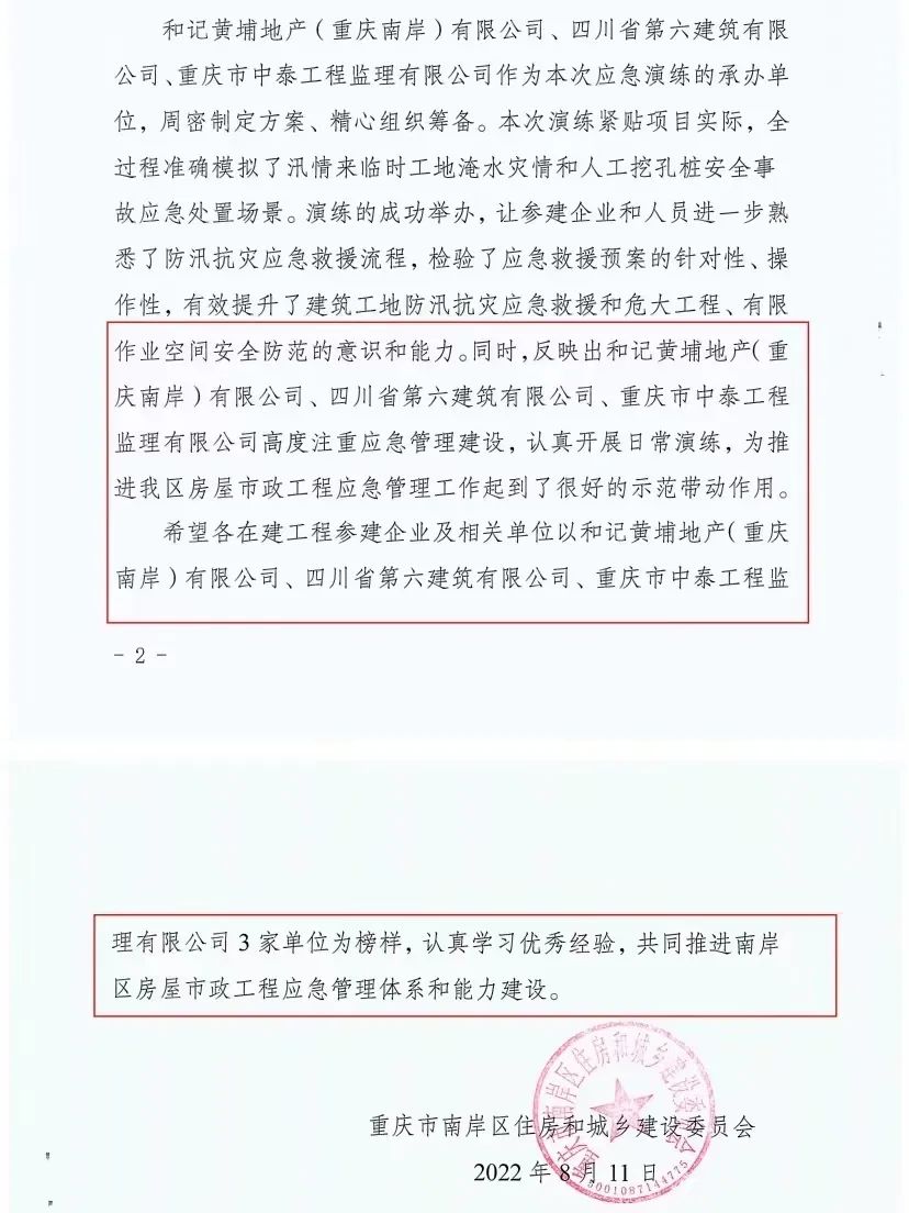 近日,重慶市南岸區(qū)住建委下發(fā)文件,對和黃楊家山4號地塊項目承辦的“防汛暨危大工程”應(yīng)急演練取得的成效給予極大肯定,對四川六建的應(yīng)急管理水平和起到的良好示范帶頭作用進行通報表揚。