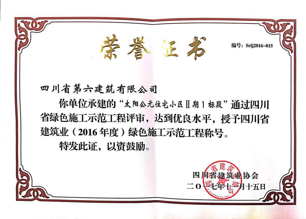 近日,由二分公司承建的太陽公元二期一標段項目榮獲2016年度“四川省建筑業(yè)綠色施工示范工程”稱號,并由四川省建筑業(yè)協(xié)會向公司代表頒發(fā)榮譽證書。