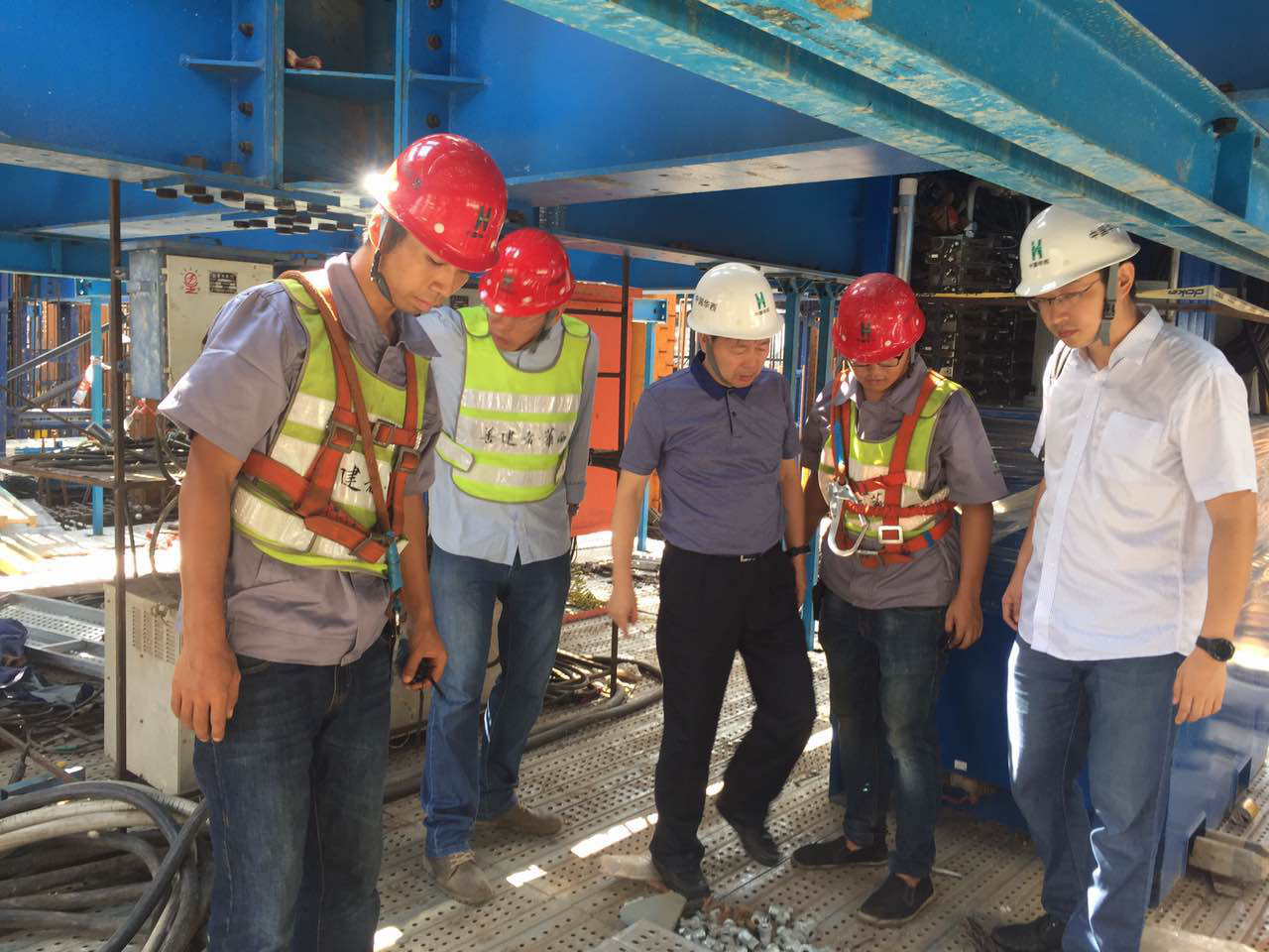 在詳細(xì)了解了項(xiàng)目的工程概況、現(xiàn)階段進(jìn)展以及后續(xù)工作安排后,調(diào)研小組還仔細(xì)查看了模架鋼平臺頂升油缸、控制柜等關(guān)鍵部件的安裝質(zhì)量,并對現(xiàn)場工藝流程、技術(shù)難點(diǎn)給予了指導(dǎo)。指導(dǎo)的同時,公司黨委書記、董事長任予鋒對項(xiàng)目部在施工期間積極面對各種困難與挑戰(zhàn)時所表現(xiàn)出來的積極向上、敬業(yè)耐勞的工作作風(fēng)表示了充分的肯定。