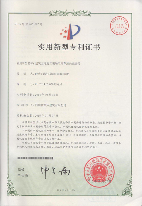 由八分公司“吉寶·沁風御庭”項目部申請的“槽鋼減速帶”榮獲國家實用新型專利,該專利于2015年1月7日起生效。 “吉寶·沁風御庭”項目位于新津縣花源鎮(zhèn),以2層聯(lián)排別墅為主,該項目地處山地,場區(qū)修筑的施工道路坡度較大,彎道較多,項目部在工地施工道路的各關鍵部位都按照常規(guī)設置了普遍使用的橡膠減速帶以確保安全行駛。但是,經(jīng)過重型施工車輛長時間的碾壓,橡膠減速帶幾乎被破壞殆盡。 該項專利的主要申請人項目部安全主管陶虎根據(jù)其地形和實際情況,利用建筑工地常用的建筑材料——槽鋼,經(jīng)過簡單的切割加工,形成減速帶的“主材”。與普通的橡膠減速帶相比,它不僅取材方便,節(jié)約資源,對坡地行車能有效減速,使用壽命長,此外還可兼作電纜或水管的保護帶。